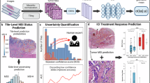 An attention-based multiple instance learning model similar to Ilse et al. was trained using these images39, as illustrated in Fig. 2c. This model architecture is suitable for the task because it allows for in-depth tile-level feature analysis while using slide-level labels of MSI status in a weakly supervised training scheme. The model accepts a “bag of tiles” as input. An ImageNet pre-trained ResNet18 model was used as a feature extraction module for each tile40, while the attention module was used to identify tiles with high diagnostic relevance and aggregate information from all tiles in the bag to make a slide-level prediction. The entire model was trained end-to-end using Adam optimizer and weighted cross-entropy loss where weights were assigned according to the class prevalence41. In each epoch during training, 200 tiles were randomly sampled to form a bag. The effective batch size was 32 during training, split across four NVIDIA A100 GPUs. At inference time, the bag size was increased to 1600 with a batch size of 1 on one NVIDIA A100 GPU. Tile sampling was performed without replacement, and if a slide had fewer tiles than the bag size, all tiles in the slide were used. Tiles were normalized with the mean and standard deviation of a reference set of H&E images. For data augmentation during training, tiles were randomly cropped to 224 × 224, randomly rotated by multiples of 90 degrees, randomly flipped, and randomly applied with color jittering.