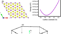 To get a better understanding of the origin of the nontrivial band topological gap, we present the schematic diagram of the Ru-d xz, d yz band and S-p z bands evolution at the Γ point under the crystal field and the SOC effect in Fig. 5a. Under the D 4h symmetry of the crystal group, five d orbitals of Ru atoms split into three single d z 2, d xy and d x 2 − y 2 orbitals and a doubly degenerate d xz, d yz orbitals. Because there are two kinds of S dimers in unit cell, the top S dimer and bottom S dimer, the four S-p z orbitals of two S dimers form the two bonding states and two antibonding states, as schematically illustrated in Fig. 5a. The band inversion occurs between the \(\left| {p_z^ + } \right\rangle\) state and the \(\left| {p_z^ - } \right\rangle\) state, where the superscripts +(−) represent the even (odd) parity of the corresponding states, respectively. It is a nontrivial band order that caused by the crystal field. According to the partial band projections in Fig. 5b, the electronic states around the EF are mainly contributed to the Ru − d xz, d yz orbitals and S-p z orbitals, so the other orbitals can be reasonably neglected in the following discussion. The d xz, d yz-orbitals also split into bonding and antibonding states due to the formation of chemical bonding between Ru and S atoms. These states can be labeled as \(\left| {d_{xz \pm iyz}^ + } \right\rangle\) and \(\left| {d_{xz \pm iyz}^ - } \right\rangle\). Without SOC, the \(\left| {d_{xz \pm iyz}^ + } \right\rangle\) and \(\left| {d_{xz \pm iyz}^ - } \right\rangle\) states are degenerate at the Fermi level, rendering the system a semimetal. When including SOC, the \(\left| {d_{xz \pm iyz}^ + } \right\rangle\) state splits into two doubly degenerate states, i.e., \(\left| {d_{xz + iyz, \uparrow }^ + d_{xz - iyz, \downarrow }^ + } \right\rangle\) and \(\left| {d_{xz - iyz, \uparrow }^ + d_{xz + iyz, \downarrow }^ + } \right\rangle\), accordingly, a nontrivial gap is opened. The symbols \(\left| \uparrow \right\rangle\) and \(\left| \downarrow \right\rangle\) do not represent real spin states for SOC, but denote two states of Kramer doublets. Obviously, the SOC-induced band exchange does not change the nontrivial band topology, for the \(\left| {d_{xz + iyz, \uparrow }^ + d_{xz - iyz, \downarrow }^ + } \right\rangle\) and \(\left| {d_{xz - iyz, \uparrow }^ + d_{xz + iyz, \downarrow }^ + } \right\rangle\) states with the same parity. Note that 2D TIs, such as SnF8 and β-SnSe2,11 also exhibit a quadratic dispersion at Γ point in the band structure without SOC. However, the type of SOC-induced band exchange is different. There is the s-p-type band inversion in SnF, and the p z-p xy-type band inversion in β-SnSe2. For this reason, the band gap is indirect in the band structure with SOC in SnF and β-SnSe2. On the contrary, a direct SOC band gap appears in RuS4 monolayer between the Ru-d xz,yz bands with the same type d orbitals, with the band inversion occuring between the \(\left| {S - p_z^ + } \right\rangle\) state and the \(\left| {S - p_z^ - } \right\rangle\) state.