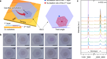The BLGs having preferred small stacking angles were characterized by SEM, SAED, and Raman spectroscopy. The SEM images of BLGs that have most preferential small stacking angles (3–5°) and their corresponding SAED patterns are shown in the left and right column of Fig. 3a, respectively. The stacking angles of BLG are measured from the rotated angle between two hexagonal diffraction patterns, and confirmed that the corresponding SAED patterns are rotated at -3°, 4°, and 5°, which is well-matched with the results observed from each SEM image of BLGs. In addition, we also obtained the SAED patterns of 1°- and 2°-twisted BLG (Supplementary Fig. 8). The BLGs are further characterized by Raman spectroscopy with 532 nm excitation wavelength. The Raman spectra of BLG exhibit clearly different features from the SLG according to stacking angles, such as intensity of the G-band, intensity ratio of 2D- and G-band (I2D/IG), and the full width at half maximum (FWHM) of 2D-band41,42,43. As shown in Fig. 3b, all the BLGs show higher intensity of the G-band than SLG. Since the G-band is induced by in-plane vibration of sp2 carbon atoms, the intensity of the G-band becomes stronger as the number of graphene layers increases44,45. In addition, the 5°-twisted BLG shows a new band at around 1612 cm−1 where the R′-band appears. It is known that the R′ mode is attributed to the superlattice modulation that activates phonons in the interior of Brillouin zone, and the R′-band is also known to appear when the stacking angle of BLG is between 5° and 9°46,47,48. Supplementary Table 1 shows the value of FWHM for the 2D-band and I2D/IG in SLG and AB-stacked BLG and each small-angle BLG (3°, 4°, and 5°). All BLGs show broader 2D-bands than SLG because of the splitting of phonon or electron bands due to the strong coupling interaction between the two layers41. Also, the 2D-band was red-shifted as the stacking angle increases. In addition, BLGs show lower I2D/IG than SLG, and as the stacking angle increases from 0° (AB stacking) to 5°, the FWHM values for the 2D-band become smaller.