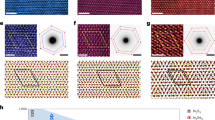 Figure 2a shows a wide area annular dark field (ADF) image of the WSe2 with extra platelet structures covering the surface. Almost 50% of the WSe2 substrate (dark contrast) is covered by the extra surface layer in brighter contrast. An EELS chemical analysis (Fig. 2b) shows the brighter contrast layer is a compound of iodine and fluorine. The W and Se peaks are shown in the low energy region around 40–50 eV. The red spectrum shows a clear iodine signal at 650 eV and fluorine edge at ~700 eV. At low energy region, iodine edge at 50 eV is overlapping with W and Se peaks which gives extra background to the WSe2 substrate spectrum. A quantitative analysis shows a wide range of the atomic ratio 0 < F:I < 4 (Supplementary Fig. 1), which suggests strong beam damage happening during the EELS experiments resulting in severe changes in the composition from the stoichiometric value. In fact, a few seconds of acquisition time for EELS always destroys the IF layers, and no longer time acquisition with a better statistic is possible. Halogens are actually known for their beam sensitives. The IF layer was originally a continuous film with a size of about 0.07 μm2 as pointed by the white arrows in a low-magnification image of Fig. 2a inset. The ADF contrast of the IF layer is slightly weaker than the overgrown WSe2 bilayer pointed by the black arrow and is distinguishable from the second layer of WSe2. In order to minimize the electron beam damage in observation at high magnification, we moved the specimen under the gun valve closed condition prior to the image acquisition. A moiré pattern is formed at IF and WSe2 overlapping area which is more clearly seen in the magnified ADF image shown in Fig. 2c. The fast Fourier transform (FFT) image shown in Fig. 2d displays the structure information of the 2D IF/WSe2 which shows a clear epitaxial relationship of the surface IF layer and the WSe2 substrate. One can see the two sets of hexagonal diffraction patterns refer to the structure of WSe2 (blue circles) and the IF layer (red circles) shown in Fig. 2d. The structure of the 2D IF layer appears hexagonal symmetry in the crystal c-axis. Note that the IF layer survives only the first scan and will go away instantly in the second. The IF layers are also sensitive to laser excitation, which makes it difficult for us to obtain their optical spectra.