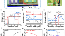 Figure 1a shows schematic and optical microscopy (OM) images of the PG-NDT device featuring a controllable potential barrier and/or well. This potential barrier and/or well was formed in the middle of the vdW channel by partially defining a gate region. As the gate voltage increases in the positive or negative direction, the energy band corresponding to part of the vdW channel shifts down or up, consequently inducing the potential barrier and/or well for injected and/or photo-generated carriers. Owing to the potential barrier and/or well that are varied by the gate voltage, it is possible to facilitate or suppress the collection of injected or photo-generated carriers at a specific voltage region, eventually leading to the abnormal decrease in the drain current (NDT phenomenon). The PG-NDT device was fabricated as follows: (i) a gate electrode with a width of 4 μm was formed on the SiO2/Si substrate. Here, the width of the gate electrode is narrower than the device channel length to be formed, which is a crucial requirement for the induction of the NDT phenomenon. (ii) Hexagonal boron-nitride (h-BN) for the gate dielectric and WSe2 for the vdW channel were simply stacked onto the gate electrode by using a residue-free transfer method employing adhesion energy engineering (Supplementary Fig. 1 and Supplementary Table 1). (iii) Then, source and drain electrodes were formed on the vdW channel, where the distance between two electrodes was 20 μm (details are presented in the “Methods” section). According to the three-dimensional (3D) atomic force microscopy (AFM) analysis, the thicknesses of the h-BN and WSe2 layers were ~52 and 51 nm, respectively (Fig. 1b). The PG-NDT device structure was also examined using cross-sectional transmission electron microscopy (X-TEM), as depicted in Supplementary Fig. 2. In particular, we confirmed the clean interface of the h-BN/WSe2 heterostructure using high-resolution X-TEM analysis (Supplementary Fig. 2). The results of the EDS analysis near the partially defined gate electrode are provided in Supplementary Fig. 3.
