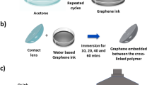 To make an inkjet printable ink requires the optimisation of c, surface tension, γ and η to ensure satellite droplet free ejection, and morphologically uniform (i.e. roughness minimisation) printed films43,47. We engineer the η of the graphene ink to ensure it is within an optimal 1–10 mPa s range required for inkjet printing43. We measure η with a parallel plate rotational rheometer (see Methods). A known shear rate is applied, and the resultant torque or shear stress is measured. The shear stress divided by the shear rate calculates the liquid viscosity shown in Fig. 5a43. We find pseudoplastic behaviour with an infinite-rate η of ~ 1 mPa s within the optimal η range (~ 1–10 mPa)43. The decrease in viscosity is attributed to the reduction in the Brownian motion of the graphene flakes48. In Fig. 5b, we determine the ink γ using the pendant drop method. The pendant drop method involves using a camera to visualise the shadow image of a droplet dispensed from a needle. The droplet’s radius of curvature is found from the shadow images that can be used with the Young–Laplace equation to determine the liquid surface tension49,50. We find a graphene ink γ of ~ 63 mN m−1, lower than the γ of water ~ 72 mN m−1, which we attribute to the presence of SDC surfactant. High c is needed to minimise the number of printing layers required to reach a thick network of flakes, thus increasing the ϕ of a printing process to create devices. In contrast, high σ is desirable to improve the performances of devices that require high σ, such as electrodes for micro-supercapacitors51, antennas52 or transistor electrodes53. Pristine inkjet printable graphene inks have commonly had low c (< 3 mg ml−1), to help minimise nozzle clogging. Identification of stabilising solvents by solubility parameter-matching16 has proven to be a useful starting point for ink formulation. However, the resultant c can be low, < 0.2 mg ml−1 44; therefore, many (>50) printing passes are required to build a percolating film of material. Other strategies have been developed to improve ink’s c. For example, vacuum filtration can be utilised with flocculation agents51 or a solvent exchange53 to redisperse graphene at high c (> 10 mg ml−1). However, the additional vacuum filtration step reduces ϕ < 1 g h−1 53 Alternately solvent interface trapping has been used engineer high c (> 100 mg ml−1) ink by trapping graphene between a polar and non-polar solvents54. GO powders also been used to directly disperse material at a high (> 1 mg ml−1) c but with low σ (< 1000 S m−1) due to the defective nature of the flakes55,56. To increase the σ, printed films are typically annealed at high temperatures >300 °C45,57. However, this process is incompatible with many textile (e.g. cotton) or polymer (e.g. polyethylene terephthalate, PET) substrates which degrade at temperatures >100 °C43. Therefore inkjet printable graphene inks with high σ (> 103 S m−1) and high c (> 10 mg ml−1), which do not clog the inkjet nozzle have been desirable but difficult to achieve. The 6000 cycles graphene ink achieves these requirements (σ > 103 S m−1, c ∼ 100 mg ml−1), however it is not compatible with most inkjet nozzles due to the flake <L > > 1 μm. Typically the flakes should be 1/50th of the nozzle diameter (a = 21 μm) to minimise nozzle clogging (∼ 420 nm)44. Therefore we centrifuge the 6000 cycles graphene ink at low speed (1k rpm, g ~ 125) to create a graphene ink Grinkjet with c ~ 5.9 mg ml−1, (Yw ∼ 6%) which minimises the probability of nozzle clogging and increases σ ∼ 5 × 103 S m−1 without annealing. We compare the σ and c of Grinkjet to others (Fig. 5c) and find that both c and σ are higher than most inkjet printable inks in the literature, where an optimal ink would be in the top right corner of the graph, assuming that the ink would not cause nozzle clogging issues or satellite droplets due to its concentration44,45,51,53,55,56,57,58,59. We use a drop-on-demand inkjet printer to print the ink. We image the jetting of the ink with a stroboscopic camera (Fig. 5d), the black dot at 0 μm represents the inkjet nozzle. The ink is observed to eject from the nozzle without satellite droplets, which is important to achieve well resolved printed films with resolution <100 μm. In Fig. 5e, we deposit the ink onto a PET substrate coated with aluminium oxide nanoparticles (Novele, Novacentrix) which have a low roughness (~18 nm). We print a 2 cm2 layout of interconnect array. Through optical inspection, we observe morphological uniformity of the print and evenly distributed flakes in the form of a film. We also inkjet print transistor contacts Fig. 5e demonstrating a ~ 50 μm gap between two graphene electrodes. The resolution of ~ 50 μm is as expected and comparable to previous works on inkjet printing47,53. These results indicate that the high concentration (5.9 mg ml−1) printable graphene inks can be produced using in-line shear mixing and can be inkjet printed at high resolution (~ 50 μm) in desirable patterns for flexible electronics.