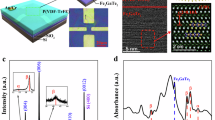 Figure 5 shows the magnetic properties of 2 nm-thick films (2 ML of Fe5GeTe2) measured by SQUID. Figure 5a and Fig. 5b show isothermal magnetic hysteresis loops at different temperatures with the external magnetic field applied in the ab basal plane, and along the c-axis of the layers, respectively. Compared to the 12 nm-thick films, MS decreases by roughly 40%, with MS = (409 ± 5) kA m−1 at 10 K (averaged over in-plane and out-of-plane measurements), corresponding to a magnetic moment m = (1.21 ± 0.01) µB/Fe. In Fig. 5c we plot the temperature dependence of Mr and fit the results to \(M_{{{\mathrm{r}}}} \propto \left( {\frac{{T_{{{\mathrm{C}}}} - T}}{{T_{{{\mathrm{C}}}}}}} \right)^\beta .\) The fitting yields TC = (229.4 ± 0.3) K and β = 0.29 ± 0.01.
