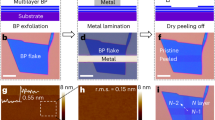 BP flakes were exfoliated from bulk crystals on the substrate and immediately capped with PMMA, both under an inert atmosphere (cf. “Methods” section). Optical images of PMMA capped exemplary flakes are shown in Fig. 1a. After identification of flakes, Ti/Au electrodes were electron-beam-lithographically defined on top (cf. “Methods” section), resulting in devices as shown in Fig. 1b. Immediately after electrode definition the devices were again covered by a protective PMMA layer. For further characterisation, Raman spectroscopy was carried out (cf. “Methods” section) on fully processed devices, revealing a spectrum as shown in Fig. 1c. The spectrum shows only the well-known intrinsic first \(({A_g^1,B_{2g}\,{\rm{and}}\,A_g^2})\) and second order (ca. 790–920 nm−1 range) Raman signatures26,27, while there is no trace of lines associated with oxidation28,29 or any other uncommon lines discernible. Combined, the presence of the two intrinsic Raman responses and the absence of any other signs indicative of oxidation or degradation shows that the BP processed into devices is free of any unintentional influences.