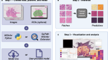 To begin, 2000 1000 × 1000 pixel image tiles were randomly cropped from n = 21 fully deidentified H&E WSIs scanned at 40x Magnification from the MATADOR19 cohort, ensuring sufficient quality (e.g., exclusion of tissue folds or blurry regions). ROIs were stain normalized based on a reference tile from the MATADOR19 cohort using the Vahadane stain normalization20 implementation from StainTools (https://github.com/Peter554/StainTools). Using the HoverNet21 implementation from histocartography 22, nuclei were segmented to provide the object location information to PS. Following the PS workflow (Supplementary Fig. 2), ROIs and corresponding object segmentation mask were uploaded into PS where nuclei were extracted from the ROI into 64 × 64-pixel patches with the nuclei centered.