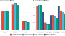 We first use the natural language generation (NLG) metrics to evaluate the quality of the generated summary. These metrics include ROUGE-L (recall-oriented understudy for gisting evaluation) and METEOR (metric for evaluation of translation with explicit ordering) scores. We also include the CHRF (CHaRacter-level F-score), which was reported to correlate highly with the readability of generated text33. Their values range from 0.0 to 100.0, with a score of 100.0 indicating that the generated summaries are identical to the reference summary. The model performance on our test is approximately normally distributed and the performance of each model is independent of others. As such, we calculated the p-value using a paired t-test to determine the statistical significance of the difference between the two models.