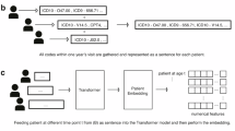where \({z}_{i}\) is the embedding of patient \(i\), \({\mathbb{V}}\) is the set of codes documented in the labeled patients’ records, \({d}_{{ij}}\) is the count of code \(j\) in patient \(i\)’s records, \({p}_{j}\) is the number of patients in the study cohort who received code \(j\), \({u}_{j}\) is the embedding of code j, and \({u}_{{j}_{0}}\) is the embedding of the target code \({j}_{0}\). For a given code, the weight is a product of two terms. The first term is the term frequency-inverse document frequency (TF-IDF) of the code, and the second term is the cosine similarity between the code embedding and the target code embedding. The greater the count number and the cosine similarity, the more significant the specific code in constructing the patient embedding.