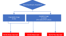 Advancements in deep learning have made it possible to automatically process medical images for various tasks, achieving performance comparable to clinical experts5,6,7,8,9. In the case of retinal diseases, deep learning models not only accurately diagnose and monitor conditions such as diabetic retinopathy and age-related macular degeneration from retinal images10,11,12, but also assist in developing personalized treatment plans13. In addition, deep learning has been applied to myopia-related screening14,15, assessing the risk of myopia progression by analyzing retinal images and enabling early intervention. Although these methods are robust, there is a need for further investigation into sophisticated morphologic patterns. A system called the Meta-Analysis of Pathologic Myopia (META-PM)16 categorizes myopic atrophic components into five classes: no myopic retinal lesions (Grade 0), tessellated fundus only (Grade 1), diffuse chorioretinal atrophy (Grade 2), patchy chorioretinal atrophy (Grade 3), and macular atrophy (Grade 4). Pathologic myopia is now defined as myopic maculopathy (according to META-PM criteria: grade 2 or above) or posterior staphyloma17. Posterior staphyloma appears as an outpouching of the ocular wall, with a curvature radius smaller than that of the surrounding sclera. Posterior staphyloma often leads to changes in the retina, choroid, and nerve fiber layer, subsequently affecting the patient’s vision. Early identification of posterior staphyloma is crucial because it can lead to severe complications, such as retinal detachment, macular hemorrhage, and choroidal neovascularization, all of which may cause irreversible vision loss. Myopic maculopathy is one of the primary causes of vision deterioration in individuals with high myopia, as it directly affects the macula. Since the macula is the area of the retina that provides the highest visual acuity, any damage to this area can significantly affect vision quality. Early diagnosis and management of these conditions can help slow or prevent disease progression and reduce the risk of vision loss. While the association between high myopia and peripheral retinal lesions is well-established, automated identification of clinically relevant morphologic patterns using ultra-widefield imaging remains a technical and practical challenge. This study bridges that gap by developing and validating a dedicated deep learning model on a large-scale and expert-annotated dataset. This advancement allows for scalable screening and risk assessment in real-world settings where access to retinal specialists and multimodal imaging may be limited.
