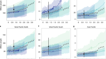 We used projected climate and population distribution under four different SSPs, which combine different demographic75 and emissions projections under consistent storylines: SSP1-2.6 (sustainability), SSP2-4.5 (middle of the road), SSP3-7.0 (regional rivalry) and SSP5-8.5 (fossil-fuelled development). We focused on 20-year mean climate states for 2020–2040, 2040–2060, 2060–2080 and 2080–2100, and the projected population distribution data of 2030, 2050, 2070 and 2090, to represent average demographic conditions of corresponding time periods (Extended Data Table 1). We obtained downscaled CMIP6 climate data available from WorldClim v.2.0 at 0.0833° (~10 km) resolution, which restricts us to up to eight CMIP6 models: BCC-CSM2-MR, CNRM-CM6-1, CNRM-ESM2-1, CanESM5, GFDL-ESM4, IPSL-CM6A-LR, MIROC-ES2L and MRI-ESM2-0 (Supplementary Table 1). We obtained SSP population projection data at 1 km resolution from the spatial population scenarios dataset76,77. The SSP population projections were derived at national level using methods of multi-dimensional mathematical demography75. Alternative assumptions on future fertility, mortality, migration and educational transitions align to the SSP storylines on future development78 (and exclude climate-induced migration). Spatially explicit data in line with those country-level projections were derived at 1/8° resolution using a parameterized gravity-based downscaling model76, and further downscaled to 1 km resolution77. We aggregated this population data to a consistent resolution of 0.0833° (~10 km) to match the climate data and our previous analyses. We combine results across climate models to create a multi-model ensemble mean, and a 5–95% confidence interval, recognizing that the number of models available varies somewhat between SSPs and time-slices (Supplementary Table 1). To this end, we apply the MAT data of each climate model to plot population density against MAT and then combine the resulting curves to calculate the mean, and 5th and 95th percentiles.