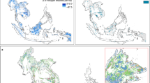 In addition to this rich and nuanced local context, agroforestry in Southeast Asia has the highest per-hectare aboveground biomass carbon stock of 60–65 tC ha−1 of all agroforestry lands worldwide12 and thus has an importance for climate mitigation beyond its scale. There are 80.5 Mha of agroforestry across Southeast Asia13, comprising 18% of its total land area. Moreover, Southeast Asia contains large tropical forest extents with high carbon stocks and global hotspots for biodiversity and endemism, which are under threat from rapid development14.