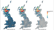 In this study, the REZ ranged from 0 to 300 metres from roads, with the latter occurring along only the busiest roads, where ‘busy’ is relative to the traffic volume threshold (see Methods for the details; Fig. 6). The 300-m threshold was chosen because most of the ecological and environmental damage of traffic is confined to several hundred metres from roads5,7,17,19,22,38,45,46,47. However, precise information on the distance from roads at which these impacts are detrimental remains limited19 and can be context specific. For example, in a comprehensive meta-analysis, the distance over which roads affect the abundances of mammals, amphibians, reptiles and birds was estimated to be 105, 48, 27 and 655 m, respectively47. How these distances are influenced by traffic volumes remains to be determined. Other factors, such as the terrain5 and land cover47 around roads and the composition of traffic on roads24, can also affect the distance over which roads impact the surrounding landscape. Limiting the REZs to maximally 300 m from roads encompasses the distance over which most ecological and environmental effects have been observed, but we acknowledge that local deviations are likely to occur.