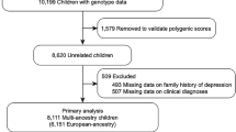 All PRS were standardized mean = 0 and SD = 1. Linear mixed model analyses were selected to be able to model covariates and relatedness within this complicated dataset. The analyses were performed using the Wald conditional F-test33 in ASReml-R software34 with one of the categories of mood disorders or family status as dependent variable and PRS as the independent variable (Supplementary Methods). Age (except for the generation analysis) and sex were fitted as fixed effects in the models. For 7 individuals in the BBF age at collection was missing and imputed to be the mean age of the relevant generation. To account for relatedness in within-family comparisons, an additive genetic relationship matrix was fitted as a random effect. The relationship matrix was constructed using LDAK software35 with weighted predictors and LD correction parameters suited for pedigree data, resulting in pairwise relatedness estimates and inbreeding coefficients on the diagonal. The variance explained by each PRS was calculated using: (var(x × β))/var(y), where x was the standardized PRS, β was the corresponding regression coefficient, and y was the phenotype36. For the analysis of offspring, we defined four spouse pair categories (“both unaffected”, “married-in parent affected”, “family parent affected”, “both affected”). While most spouse pairs contribute 1 or 2 children to the same offspring category (Supplementary Table 1); two “both affected” spouse pairs contribute 7 and 8 children, respectively. To prevent bias in our analysis in the event of more than one child per couple, we calculated the mean PRS for all offspring per spouse pair and entered this in the model as being one representative child for that couple. All p-values reported are uncorrected for multiple testing, since all tests concern overlapping individuals and thus have a complex dependence structure. However, we have performed 42 tests as listed in Supplementary Table 4, and so a conservative Bonferroni threshold for p < 0.05 is 0.001.
