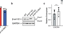 To the best of our knowledge, this work has revealed a new element of GPCR signaling whereby plasma membrane and internal pools of CXCR4 communicate to regulate cell signaling. These observations are distinct from previous work investigating intracellular GPCR signaling, where receptor internalization or OCT3 channel-permeable ligands were required2,3,4,7,52,53. CXCR4 PTM is dependent on Gβγ activation and β-arrestin-1 plays a specific role in regulating intracellular CXCR4 PTM. This work expands upon the β-arrestin signaling at a distance concept and supports a model, where β-arrestins are not only able signal at a distance at the plasma membrane, but also regulate communication between plasma membrane and internal GPCR populations to influence agonist-dependent transcriptional programs. A model for communication between plasma membrane and intracellular pools of CXCR4 and its ramification on signaling is summarized in Fig. 5c. There are several potential mechanisms for how this communication may occur that warrant additional research.