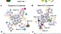 Electrophysiology data were processed with IGOR (Wavemetrics, Lake Oswego, OR), Clampfit (Molecular Devices, Sunnyvale, CA), and SigmaPlot (SPSS, Inc., San Jose, CA). Normalized tail currents were plotted versus prepulse voltage and fitted with the Boltzmann function G = G0 + 1/(1 + exp(V − V1/2)/S), where G0 is the minimum conductance, V1/2 is the half-maximal voltage of activation, and S is the slope factor. Dose–response curves in Fig. 3 were fitted with the Hill equation, E = Emax/(1 − EC50/C)P, where EC50 is the drug concentration producing the half-maximum response and P is the Hill coefficient. In Fig. 7c, e, the EC50 values were obtained by fitting the data to IKs = IMin + (IMax − IMin) ([CP1]/([CP1] + EC50)) and V1/2 = V1/2 min + (V1/2Max − V1/2 min) ([CP1]/([CP1] + EC50)). The deactivation time course was fitted with single-exponential function. All data are expressed as mean ± SEM (n ≥ 3 or otherwise indicated). Electrophysiology experiments were performed on at least two separate batches of oocytes or myocytes to confirm reproducibility. The significance was estimated either using unpaired two-tailed Student t tests (Fig. 7g) or one-way Tukey–Kramer ANOVA test (Fig. 1d and Fig. 7g). Statistical significance: P ≤ 0.05.