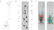 L5 model circuits were constructed from 400 PCs and 50 FS model cells. PCs were divided into an equal number of PT and IT type cells. A random distribution of cells within a square, measuring 500 μm on each side, was assumed. The coordinates of the cells were determined by random numbers from 1 to 500. Model cells were assumed to have a probability of forming synaptic connections with cells located within 150 μm. Postsynaptic cells were randomly selected from candidates with a connection probability observed in slice experiments. Connection patterns including connection probabilities from IT to IT7,8, PT to PT8, IT to PT7, FS to FS27, and between PC and FS cells22,27 are shown in Fig. 5b. In the circuit model, electrical synapses were formed between the dendritic compartments of FS cells. In our slice experiments, reciprocal chemical synaptic connections were frequently observed only in electrically connected FS cell pairs27. Therefore, no reciprocal chemical connections were formed between electrically unconnected FS cells.