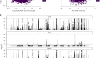 We replicated low-frequency variants identified in the discovery study in four independent datasets (N = 5356). All three variants identified from the discovery GWAS showed directionally consistent associations in the individual replication datasets and for rs79617270 and rs139620151, statistically significant associations were observed (P between 0.005–0.008, Table 1 and Supplementary Table 13). Although the missense variant (rs79314063) in the POT1 gene did not show statistically significant association with LTL in the replication datasets alone (P = 0.146), the replication data improved overall meta-analysis association levels (Table 1, Meta P = 6.94 × 10−10). Additionally, we evaluated identified variants in a separate Singaporean Chinese dataset with WGS data (N = 154). The variants showed similarly consistent direction of effects in this dataset and rs139620151 was statistically significant (P = 0.009, Supplementary Table 14). Further adjustment for smoking status did not affect the LTL associations of these SNPs (Supplementary table 15).