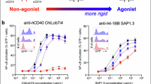To date, there remains no crystal structure of a bivalent mAb-TNFR complex due to technical challenges associated with the size of the complex and the flexible IgG hinge. However, a wealth of information has been generated on the functional requirements of agonistic mAb. For example, we previously demonstrated that the complex interplay between epitope, isotype and FcγR availability determines the agonistic activity of anti-CD40 mAbs, and similar principles are being applied to other TNFRs7,8,9,47. Fluorescence microscopy has shown that TNF ligands and agonistic mAbs induced TNFR clustering on the cell surface; however, the requirement for secondary crosslinking remains unresolved46,48,49,50. For example, both secondary crosslinking-dependent and independent clustering of Fas were reported for soluble FasL and agonistic anti-Fas mAb51,52,53. Such discrepancies may result from the different qualities of recombinant proteins and cell types used. Irrespective of these technical issues, mechanistic insight into TNFR activation remains limited beyond a known blanket requirement for receptor clustering, with data generated to date indicating a binary relationship between clustering and agonistic activity, and a detailed mechanism to account for the differential agonism exhibited by multiple mAb agonists remains lacking.