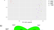 A total of 16,212 genes were expressed (count per million (CPM) > 0.5 in at least two samples) in all 47 samples (Supplementary Data S3), representing approximately 60% of the 27,332 reindeer genes reported in the draft reindeer genome assembly annotation file3. The highest number of genes were expressed in metacarpal adipose tissue (n = 15,554), followed by prescapular (n = 14,998) and perirenal (n = 14,837) adipose tissues. Moreover, we examined the expressed genes across these three tissues to search for shared and uniquely expressed genes in the respective region and season (Fig. 1a–d). In all the cohorts (spring and winter Finnish and Even samples), the highest number of expressed genes was found in the metacarpal adipose tissue. This tissue also displayed a higher number of tissue-specific expressed genes than did the perirenal and prescapular adipose tissues (Fig. 1a–d). In various region–season comparisons between the adipose tissues, >12,800 genes were commonly expressed. To assess expression similarity among the samples, we performed principal component analysis (PCA) based on the top 500 most variable genes (Fig. 2 and Supplementary Fig. S1a–c). The PCA plot (Fig. 2) shows that the metacarpal tissue samples were clustered separately from the other two tissues, and additional grouping of the samples along axis 2 based on two reindeer breeds. Similarly, a hierarchal clustering based on the top 25 genes with the highest variance across all samples also showed a similar pattern that clearly separated metacarpal tissue and the other tissues (Supplementary Fig. S2).
