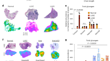 Metabolic reprogramming is a hallmark of tumor cells and has been recently regarded as a key contributor in tumor progression26. In this study, we found that upregulated and downregulated DE genes in metastatic samples were enriched in glycolysis and lipid metabolism pathways, respectively, thereby indicating that the imbalance of glycolysis and lipid metabolism may promote LUAD metastasis. Glycolysis is known to facilitate tumor invasion and metastasis27. Among the eight upregulated glycolytic genes, ALDOA, GAPDH, LDHA, and PGAM1 have been reported to be associated with poor prognosis28,29,30,31. Lipid metabolism and its metabolites can also induce tumor aggressiveness in LUAD32. Therefore, we extracted corresponding eight upregulated glycolytic genes and three downregulated lipid metabolic genes to characterize the metabolic reprogramming patterns of the samples and found LUAD to be clustered into three phenotypes (MPs). MP-III, characterized to have significantly high glycolytic and low lipid metabolic levels, was enriched in distant metastatic samples and associated with the poorest prognosis. Notably, in the TCGA dataset, there was no significant difference in stage I patients’ OS between the high- and low-glycolysis groups clustered by eight glycolytic genes (log-rank P = 0.66, Supplementary Fig. 5a, b). While, in the high-glycolysis group, the patients with low expression patterns of lipid metabolism exhibited significantly shorter OS than the others (log-rank P < 0.0001, Supplementary Fig. 5c, d). These results suggested that high glycolytic and low lipid metabolic levels might synergistically accelerate tumor progression in LUAD. Additionally, we also found that a lot of other glycolytic and lipid metabolic genes were significantly correlated with the MPs (Pearson correlation, FDR < 0.05, Supplementary Data 2), such as a key glycolytic enzyme (PKM) gradually increasing from MP-I to MP-III. Suggesting the stronger dysregulations of the two kinds of pathways in MP-III.