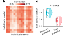 Propofol (a potent agonist of inhibitory GABA-A receptors98,99) was administered intravenously using an AS50 auto syringe infusion pump (Baxter Healthcare, Singapore); an effect-site/plasma steering algorithm combined with the computer-controlled infusion pump was used to achieve step-wise sedation increments, followed by manual adjustments as required to reach the desired target concentrations of propofol according to the TIVA Trainer (European Society for Intravenous Aneaesthesia, eurosiva.eu) pharmacokinetic simulation program. This software also specified the blood concentrations of propofol, following the Marsh 3-compartment model, which were used as targets for the pharmacokinetic model providing target-controlled infusion. After an initial propofol target effect-site concentration of 0.6 µg mL−1, concentration was gradually increased by increments of 0.3 µg mL1, and Ramsay score was assessed after each increment: a further increment occurred if the Ramsay score was lower than 5. The mean estimated effect-site and plasma propofol concentrations were kept stable by the pharmacokinetic model delivered via the TIVA Trainer infusion pump. Ramsay level 5 was achieved when participants stopped responding to verbal commands, were unable to engage in conversation, and were rousable only to physical stimulation. Once both anaesthesiologists and the anaesthesia nurse all agreed that Ramsay sedation level 5 had been reached, and participants stopped responding to both tasks, data acquisition was initiated. The mean estimated effect-site propofol concentration was 2.48 (1.82–3.14) µg mL−1, and the mean estimated plasma propofol concentration was 2.68 (1.92–3.44) µg mL−1. Mean total mass of propofol administered was 486.58 (373.30–599.86) mg. These values of variability are typical for the pharmacokinetics and pharmacodynamics of propofol. Oxygen was titrated to maintain SpO2 above 96%.