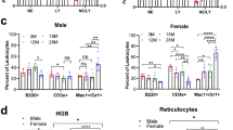 Mouse peripheral blood cell counts were measured by Hemavet (Drew Scientific). For flow cytometry lineage analysis, peripheral blood or bone marrow nucleated cells were stained with an antibody cocktail containing anti-CD11b and anti-Mac1 for myeloid cells, anti-B220 for B cells and anti-CD3e for T cells. For bone marrow stem cell analysis and sorting by side population, cells were stained with 5 µg/mL Hoechst 33342 at 37 °C in the DMEM+ media (DMEM with 2% heat-inactivated fetal bovine serum and 1 mM HEPES) in a density of 1 million cell per mL for 90 min exactly, followed by depleting lineage-positive cells using EasySep Stem Cell Enrichment Kit (StemCell Technologies). Then the enriched cells were labeled with PE-conjugated lineage antibody cocktail and other cell markers. Mouse hematopoietic stem cells in the BABL/c strain were analyzed by flow cytometry using the PE-Lin/Side Population/APC-CD150 combination, as described previously35. Flow cytometry analysis and cell sorting were carried out at the City of Hope Analytic Cytometry Core.