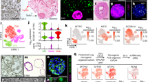 a Phase and HE staining images of human bronchial organoids (BO). b TEM images of BO. Larger images are shown in Supplementary Fig. 1. c Immunohistochemistry analysis of KRT5 (basal cell marker), acetylated α-tubulin (ciliated cell marker), MUC5AC (goblet cell marker), and CC10 (club cell marker) in BO. Panels a–c are representative of three independent experiments.
