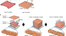 Analogue to biorobotic systems, for the generation of functional muscle implants high cell densities and a high degree of cell alignment need to be achieved to ensure excellent biofunctionality of the tissue. In order to achieve this, in current research extrusion-based 3D-bioprinting methods are employed. The extruded bioink strands result in aligned polymer fibers that guide cell elongation parallel to the printing path140. Alternatively, contact guidance and mechanical reinforcement strategies have been applied to modulate cell alignment and the elastic modulus of the tissue36,54,66 (Fig. 6h, i).