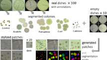Classification of rod-shaped, dividing and microcolonies was performed using the time series described in section ‘Segmentation of E. coli bright field images’. Individual frames from several time series were used for training. To generate the training dataset, individual frames spread over the entire time series (typically frames 1, 15, 30, 55 and 80) were converted into PNG format. For the large field-of-view model, the entire image was used, while images were split into 4 regions of 256 × 256 px² size for the small field-of-view model. Images were annotated using LabelImg49. The final training dataset contained 25 (100 for small field-of-view) annotated patches, and dataset size was increased 4x during training using data augmentation implemented in the ZeroCostDL4Mic YOLOv2 notebook (rotation and flipping).