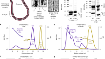 The synaptonemal complex (SC) is a ‘zipper’-like protein assembly that mediates synapsis of homologous chromosomes, facilitating their recombination and crossover formation, during meiosis10. The supramolecular SC is generated by the interactions and self-assembly of its coiled-coil protein constituents11. In the mammalian SC, TEX12 is an essential component that binds to SYCE28,12, forming a complex that self-assembles to provide the SC’s fibrous ‘backbone’ (Fig. 1a)13,14. Human SYCE2-TEX12 is a rod-like 2:2 complex in which linear chains of TEX12’s structural core (amino-acids 49–123) bind to an SYCE2 dimer in an intertwined coiled-coil configuration (Fig. 1b)14. This ‘building-block’ structure undergoes hierarchical assembly driven by TEX12’s C-terminal tip (Ctip; amino-acids 114–123) (Fig. 1b, c)14. Firstly, 2:2 complexes interact in parallel, forming a 4:4 complex that is stabilised by Ctip coiled-coils binding together interacting complexes at both ends of the molecule. A conformational change of the Ctip coiled-coiled from parallel to anti-parallel then forms end-on interactions between 4:4 complexes, which are recursive, so mediate the assembly of long fibres. Assembly of 2:2 complexes is blocked by deletion of TEX12’s Ctip (ΔCtip) or glutamate mutations of its heptad amino-acids (LFIL; L110E F114E I117E L121E), whereas 4:4 complexes form but fibrous assembly is blocked by alanine mutations of solvent-exposed amino acids (FFV; F102A F109A V116A) (Fig. 1b, c)14. Thus, SYCE2-TEX12 can be locked into specific assembly intermediates by deletion and mutations of TEX12’s Ctip.