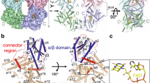 SAXS experiments were performed at beamline BL19U2 of the National Facility for Protein Science Shanghai (NFPS) at the SSRF. The X-ray wavelength λ was 0.9184 Å. Scattered X-ray intensities were collected using a Pilatus 1 M detector (DECTRIS Ltd). The sample-to-detector distance was 2.30 m, thus measuring signals in the resolution range 0.008–0.47 Å−1 as defined by momentum transfer (q = 4π sinθ/λ, where 2θ is the scattering angle). For high-performance liquid column (HPLC)-SAXS, the buffer used was 50 mM HEPES pH 7.4 buffer containing 150 mM NaCl and 5% glycerol. SEC-HPLC was performed using a Superdex200 column (GE). The Agilent chromatographic system of the BL19U2 beamline of the NFPS at the SSRF63 was operated at a 0.50 mL∙min−1 flow rate. The columns and SAXS flow cell were maintained at 25°C. The protein concentration was from 2 to 10 mg∙mL−1 in the aforementioned buffer. After centrifiltration, 100 μL of sample solution was injected into the Superdex 200 Increase 10/300 GL column (GE). Two-dimensional scattering images were converted into one-dimensional SAXS curves through azimuthal averaging after solid angle correction and then normalized using the intensity of the transmitted X-ray beam; this was performed using the software package BioXTAS RAW64. Background scattering was subtracted using PRIMUS in the ATSAS software package65. SASTBX software was used to compute theoretical profiles of atomic structures and fit them to experimental SAXS data66. The SAXS data range for model fitting is truncated to proper regions as suggested by the GNOM program of ATSAS software. Low-resolution envelopes of molecules were computed using decodeSAXS67. The theoretical profile calculation and envelope model reconstruction were done with default parameters (more details about data collection and analysis are given in Supplementary Table S6).