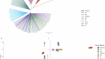 We utilized the PLINK v1.981 -genome option to calculate the genetic relationship (shared proportion of IBD) between pairs of individuals for each breed and removed the one with a lower sequencing detection rate for PI_HAT > 0.5 pairs (Supplementary Data 3). For the remaining 636 XGG, a total of 50 XGG were randomly selected to form 257 individual datasets (10,767,528 SNPs) with other breeds for population genetic analysis. Then, an NJ tree of 257 individuals was reconstructed using PHYLIP v3.6982 based on the identical-by-state matrix calculated by the “plink -distance-matrix” command and finally visualized via Figtree v1.4.2 (http://tree.bio.ed.ac.uk/software/figtree/). Afterward, we ran GCTA v1.9283 using the above SNPs to produce a genetic relationship matrix and extract the first four eigenvectors for PCA analysis. SNP sites with r2 > 0.2 were eliminated to decrease the influence of LD (measured as r2), and 749,370 SNPs were retained to estimate the ancestral consanguinity component (from K = 2 to 10) of each population by ADMIXTURE v1.3.084 with 10-fold cross-validation.