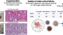 Ovaries were processed as previously described in ref. 61. Briefly, cortical tissue was separated from medulla and further processed to remove medulla tissue and thinned cortex was cut into fragments of roughly 3 × 12 mm. Each cortical strip was then equilibrated in cryoprotectant solution in cryovials, slow-frozen and stored in liquid nitrogen until thaw and transplantation. All tissue was obtained from donors and patients with informed consent and with approval of the Weill Cornell Institutional Review Board—Study title: Low temperature preservation of ovarian tissue; Study number: 0803009702.