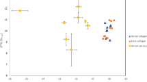 In addition to different tissue formation times, bone and enamel also differ in the composition of their organic matter. While the organic fraction of bone consists mainly of collagen (90%), the organic matter in enamel is comprised of enamel-specific proteins (predominantly amelogenin) and proteases27,52,53,54. There should thus not necessarily be a perfect 1:1 correlation between δ15Nenamel and δ15Nbone-collagen. Nevertheless, the positive correlation between enamel and bone collagen from the same individuals and the clear enrichment in δ15Nenamel across trophic levels confirm that δ15Nenamel records diet and trophic level in a manner similar to δ15Nbone-collagen.