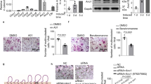 a Western blot analysis of NFATc1 protein level during osteoclast differentiation under fluid shear stress (FSS) treatment for 1 day, 3 days or 5 days. b Representative images of TRAP staining during osteoclast differentiation under FSS treatment for 1 day, 3 days or 5 days (left). Scale bar, 200 μm. Quantification of the number of multinucleated cells per cm2 (right). (n = 0–231, from three independent experiments). c Western blot analysis of NFATc1 protein level during osteoclast differentiation under hypergravity (HG) treatmentfor 1 day, 3 days or 5 days. d Representative images of TRAP staining during osteoclast differentiation under HG treatment for 1 day, 3 days or 5 days (left). Scale bar, 200 μm. Quantification of the number of multinucleated cells per cm2 (right). (n = 0–291, from three independent experiments). e Western blot analysis of NFATc1 protein level during osteoclast differentiation under microgravity (MG) treatment for 1 day, 3 days or 5 days. f Representative images of TRAP staining during osteoclast differentiation under MG treatment for 1 day, 3 days or 5 days (left). Scale bar, 200 μm. Quantification of the number of multinucleated cells per cm2 (right). (n = 0–377, from three independent experiments). g QRT-PCR analysis of Ano1 mRNA level during osteoclast differentiation under FSS treatment for 1 day, 3 days or 5 days. (n = 3 independent experiments). h Western blot analysis of Ano1 protein level during osteoclast differentiation under FSS treatment for 1 day, 3 days or 5 days. i QRT-PCR analysis of Ano1 mRNA level during osteoclast differentiation under HG treatment for 1 day, 3 days or 5 days. (n = 3 independent experiments). j Western blot analysis of Ano1 protein level during osteoclast differentiation under HG treatment for 1 day, 3 days or 5 days. k QRT-PCR analysis of Ano1 mRNA level during osteoclast differentiation under MG treatment for 1 day, 3 days or 5 days. (n = 3 independent experiments). l Western blot analysis of Ano1 protein level during osteoclast differentiation under MG treatment for 1 day, 3 days or 5 days. All data are the mean ± s.e.m. Statistical analysis with more than two groups was performed with two-way analysis of variance (ANOVA) with Šídák post-hoc test to determine group differences. *p < 0.05, **p < 0.01, ***p < 0.001.