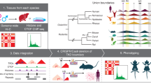 Transgenic mice were generated using the Mus musculus FVB strain and a standard CRISPR/Cas9 microinjection protocol50. Briefly, Cas9 protein (Integrated DNA Technologies catalog no. 1081058) at a final concentration of 20 ng/μl was mixed with sgRNA targeting the intended locus (50 ng/μl, for all sgRNAs combined), in microinjection buffer (10 mM Tris, pH 7.5; 0.1 mM EDTA). The mix was injected into the pronuclei of single cell stage fertilized FVB embryos obtained from the oviducts of super-ovulated 7–8 weeks old FVB females mated to FVB males (See Supplementary Data 8 for sgRNA sequences). The injected embryos were then cultured in M16 medium supplemented with amino acids at 37 °C under 5% CO2 for ~2 h. The embryos were subsequently transferred into the uteri of pseudo-pregnant CD-1 surrogate mothers. Founder (F0) mice were genotyped using PCR with High Fidelity Platinum Taq Polymerase (Thermo Fisher) to identify those with the desired NHEJ-generated deletion breakpoints. Sanger sequencing was used to identify and confirm deletion breakpoints in F0 and F1 mice (Supplementary Fig. 11, Supplementary Data 8 for CRISPR sgRNA templates and Supplementary Data 9 for primer sequences and PCR amplicons). Between one and four F0 founders were obtained for each of the TAD boundary deletion loci, each of which were simultaneously assayed for possible inversions by PCR. Only those F0 founders that harbored clean deletion alleles were backcrossed to wild-type mice and bred to procure F1 heterozygous mice. Given that each of the deletions across founders were consistent in the NHEJ-mediated deletion span, only one founder line for each locus was eventually selected to expand breeding for experiments in this paper. Additional confirmation and visualization of the deleted TAD boundaries is evident in Hi-C contact matrices resulting from Hi-C experiments on tissue from homozygous TAD boundary mutants compared to wild-type mice (Supplementary Fig. 11).