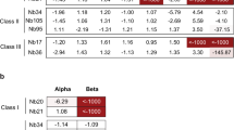 CDR loops contain sequence motifs for epitope recognition45,46,47,48. To identify such motifs we analyzed a subset of interfaces from cluster A1, designated A1S1, that recognized ES with a similarity of ≥0.9. A1S1 consists of 28 members (cluster A1 has 56 members of similarity ≥0.85). All the members of A1S1 recognize the same ES set (ES8, 9, 12, 13, 16, 18, and 19) (Fig. 5c), utilize the same CDR loops, and superpose well. Analysis of the residues of CDR1, 2, and 3 that contact the RBD indicated those residues that are preferentially utilized by this stringently selected cluster of Abs. For the binding motifs of CDR1, 2, and 3 of A1S1, the favored residues are summarized in a WebLogo plot (Fig. 5c). Remarkably, Y, S, G, and T predominate for all CDR except CDR3 which exploits R in most instances. Thus, application of a more stringent ES similarity score helps to identify the preferred binding motif utilized by the Ab of the same subgroup. This stringent grouping of Abs and Nbs, based on high similarity score of their respective ES, may prove a useful adjunct in structure prediction based on amino acid sequence and antibody competition. Previous work identified the over-represented public class of mAbs encoded by IGHV3-53 and IGHV3-66 that neutralize the spike45,49,50. We also investigated the V(D)J gene combinations representing those mAb structures (Supplementary Fig. 6a). Among 6316 mAb sequences in the CovAbDab, the top three IGHV genes are 3–30, 1–69 and 3–53, and IGHJ genes are 4, 6 and 3. However, the top IGHV genes for the structural representatives are 3–53 and 3–58 and IGHJ gene 4, 6, and 3 combined (see blue heat map). A large cluster based on the gene combination similarity, GA1 (IGHV3-53/IGHJ6), as shown in Supplementary Fig. 6b, has an ES set of (8,9,13,16,18,19) which is related to the cluster of A1S1 (Fig. 5c). However, GA1 is a subset of the cluster A1S1 (17 vs 28 members).