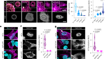 LoVo cells encode for an aberrant uncleaved MET receptor of 190 kDa constitutively phosphorylated independently from the ligand14. This alteration occurs at a post-translational level, and MET gene is neither mutated nor amplified in these cells14. Thus, LoVo cell line represents a unique and ideal model to study MET-driven phenotypical alterations in cancer cells. By means of CRISPR/Cas9 technology15, we performed a MET gene KO. Successful MET ablation was confirmed by protein analyses both by western blot (Fig. 1a) and immunofluorescence (Fig. 1b). In line, the activation of MET downstream effectors, AKT and ERK appeared downregulated in MET-KO cells (Fig. 1a). Furthermore, MET-KO ablation reduced cell proliferation rate (Fig. 1c) and triggered an impressive modification in the cell phenotype: indeed, the typical fibroblastic-like feature of MET aberrant cells was clearly reverted upon ablation, turning the cells into a squamous epithelial shape with enhanced cell boundaries (Fig. 1d). The Ptychographic quantitative phase imaging technology of Phasefocus LivecyteTM system allowed to precisely assess in living cells several morphometric parameters by measuring the main phenotypical changes derived from MET silencing. First, we detected a statistically significant increment of the cellular area and the perimeter (Fig. 1e, f) in MET-KO compared to MET aberrant (MET + ) cells. In addition, the morphological differences triggered by MET ablation were confirmed by a remarkable increase in length-width ratio (Fig. 1g), suggesting an elongated cell shape associated with a strong reduction in cells’ sphericity (Fig. 1h). Prompted by the remarkable morphological changes observed, we further investigated the actin microfilaments organization of the MET-KO cells in comparison with the control cells, where MET signaling is constitutively activated. Using both 2D standard immunofluorescence (Fig. 2a) and 3D reconstruction from confocal imaging (Fig. 2b), we recorded a precise orientation of the actin cytoskeleton. In detail, the 3D rendering revealed that MET-activated cells bear aberrant actin structures, located close to the nucleus, associated with a well-defined rounded nuclear architecture, and distributed over the entire cell height (Fig. 2a, b, white arrows). In normal conditions, nuclei are usually covered and stretched by bundles of actomyosin, which connects the nuclear envelope to the cytoskeleton. In MET+ cells, the derailed actin fibers alignment leads to the coalescing of the fibers in the apical plane, by forming actin structures, to which we refer to as actin-patches. Notably, MET KO cells reverted to a quasi-normal actin filament fibers configuration (Fig. 2a–c) with the actin-patches structures completely disappearing, while remaining stable over time in aberrant MET+ cells (Fig. 2c). Interestingly, the nuclear height impressively decreased upon MET ablation, and these changes were evident already after 24 h from seeding (Fig. 2d). On average, after 48 h the nuclear height measured about 12 μm in MET+ positive cells, while in KO the average height was about 8 μm (Fig. 2d and quantification). Through the Operetta CLS High-content screening system we performed further quantitative analyses on a large number of cells. MET-KO cells despite having increased nuclear volume and surface area (Supplementary Fig. 1a, b), displayed decreased nucleus sphericity and height (Supplementary Fig. 1c, d), with a markedly prominent nucleus footprint area (Supplementary Fig. 1e) consistent with a flat squamous morphology. Aiming to confirm these observations in additional MET+ dependent cellular models, we decided to evaluate actin cytoskeleton morphology in human gastric carcinoma GTL16 cells, characterized by MET activation due to > 10 fold MET gene amplification and overexpression, in absence of activating mutations16. Intriguingly, around 20% of analyzed cells showed actin aberrations like the actin patches detected in LoVo cell line (Supplementary Fig. 2a, b - white arrows), associated with spherical nuclei (Supplementary Fig. 2c). We further employed ultrastructural imaging by transmission electron microscopy (TEM) to visualize the aberrant actin patches in MET+ cells. Intriguingly, TEM analysis highlighted abnormal groups of internalized microvilli-like structures (Fig. 2e, detail on the right) collected inside rounded and disorganized actin-based thick bundles (Fig. 2e, left panel, white arrows). We propose that the perinuclear microfilaments, by coalescing at the cell surface, could induce a global invagination of the cell membrane and consequent internalization of the apical microvilli. Next, we set to confirm by live-cell imaging that these actin patches were not caused by artifactual fixation of actin bundles. We employed a retroviral vector encoding for the LifeAct peptide, which is able to stain actin microfilaments in living cells without impairing actin polymerization17, conjugated with mCherry fluorophore. We monitored overtime the actin dynamics of MET aberrant cells stably expressing mCherry-LifeAct. As reported in Supplementary videos 1 and 2, LoVo-LifeAct replicated the actin-patches aberrations observed in fixed cells, and by monitoring them over time, we recorded structures highly dynamic and continuously rotating around the nucleus (Supplementary Fig. 3a, Supplementary videos 1 and 2). Better resolved images of the aberrant actin patches were obtained in label-free conditions by means of Optical Diffraction Tomography (ODT), which detects variations between the refractory indexes (RI) of different cell compartments. With ODT imaging, the actin patches appeared as circular structures with a higher RI on the edges and a lower RI inside, where a jagged and reticular pattern suggests the presence of chaotic actin filaments (Fig. 2f, Supplementary Fig. 3b). The overlap between LifeAct and Phalloidin signal with ODT detection was confirmed in fixed cells as reported in Suppleme
