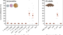 Interestingly, larval settlement fluctuated through time with peaks and troughs that were often consistent amongst cues within a species, and across taxa. This consistency suggests that fluctuations in settlement are likely reflective of larval behaviour and physiology and not cue variability alone, thereby challenging the assumption that competency gradually wanes over time. Periods of inactivity during the competency window, such as was seen in the bimodal pattern of every species tested beyond 40 days (A. hyacinthus, D. matthaii, D. pallida, O. crispa, and Mycedium elephantotus) (Fig. 3) could represent a ‘bet-hedging strategy’70, where a pulse of local settlement is followed by a metabolically inactive period of pelagic dispersal facilitating connectivity to non-natal areas for colonization when settlement competence increases once more. This is supported by evidence from Graham et al.68 indicating that larvae can enter a state of low metabolic activity shortly after becoming competent to settle, supporting the capacity for long-distance dispersal. The ‘desperate larval hypothesis’—the notion that larvae become less discriminatory as they age21,36,71,72—may also explain the resurgence in settlement behaviour at later timepoints; indeed, some species settled in response to more cues during later timepoints (i.e. D. matthaii and D. pallida), while the prevalence of indiscriminate settlement—settlement in the absence of any cue—also increased through time (Fig. 3). However, the conditioning time of the disc necessarily increased with larval age and it’s likely that benthic communities on all substrates changed in culture over time; thus, potential variability in inductivity of substrates cannot be ruled out as a driver of this resurgence. Whether this temporal variation has realized consequences for dispersal also depends heavily on survival throughout the pelagic period (Fig. 4).