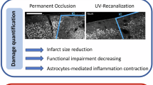 Focal cerebral ischemia was induced by the middle cerebral artery occlusion (MCAO) method as described previously63. Briefly, mice were laid on their backs and carefully placed on a 37 °C heating pad. A surgical incision in the neck region was made to expose the right common carotid artery (CCA). After ligating the distal side and the proximal side of the CCA, a small incision was subsequently made between the two ligatures. Then, a silicon rubber-coated monofilament with a rounded tip (Diccol, Cat# 7023910PK5Re) was inserted intraluminally. The monofilament was introduced along the internal carotid artery until the origin of the MCA was occluded. The monofilament was left for 2 h to prompt transient focal cerebral ischemia. Afterward, reperfusion was performed by withdrawing the monofilament for another 22 h. Sham surgery was achieved by inserting the monofilament but not to the MCA, then withdrawing immediately, leaving the CCA ligation permanently.