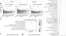 To better understand the functions of DEGs, we next did KEGG pathway and GO enrichment analysis, utilizing upregulated and downregulated DEGs in Gtl2 polyA knock-in placentas, respectively (Supplementary Figs. 5–6). MKI and HOMO placentas had more upregulated DEGs, which might be responsible for the abnormal phenotypes. So, we focused on the KEGG (Fig. 3f) and GO (Supplementary Fig. 7) terms enriched by upregulated DEGs, and those were significant in MKI and HOMO, but not significant in PKI. Among these KEGG terms, ‘Cytokine-cytokine receptor interaction’ is key in luminal epithelium proliferation, trophoblast development, and uNK maturation during pregnancy39. ‘ECM-receptor interaction’ is involved in cell migration and vessel formation in placentation40, especially in trophoblast giant cell migration41. Trophoblast giant cells lie at the edge of junctional zone, next to the maternal decidua in mouse. That may be related to the expansive junctional zone in MKI and HOMO placentas.