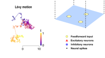 Figure 1b shows a coherent, localized spiking pattern emerging in area 1 and 2 circuits, respectively. This localized pattern hovers around one location for a while and then switches to another location, exhibiting clusters of small movement step-sizes that are intermittently interspersed by long jumps (Supplementary Fig. 1 and Supplementary Movie 1). This intermittent propagation of the localized activity patterns can be characterized as superdiffusive Lévy motion (Supplementary Fig. 2a), as in our previous study35. Notably, superdiffusive Lévy motion has been demonstrated to underlie the propagation of neural population activity in the MT area of monkeys36 as well as in the hippocampus of mice37,38. We first illustrate that the propagating wave patterns capture a range of realistic neural dynamics. By tracking the center of mass of these wave patterns (see Methods), we find that when a pattern dwells around one location, spiking activity at the corresponding location exhibits vigorous ensemble, which then return to a relatively quiescent state after the pattern moves away (top rows in Fig. 1c and d); consequently, neurons fluctuate between phases of vigorous (On state) and faint (Off state), resulting in bursting activity. Note that it has been shown that such On-Off transitions in spontaneous activity are a general feature across multiple brain regions of behaving monkeys21,39.