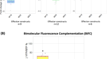 The 2D HSQC experiments monitoring the interaction between different SIB1 peptides and 15N-labeled WRKY33_C were conducted at 25 °C using a buffer containing 30 mM MES (pH 6.0), 50 mM NaCl, 20 μM ZnSO4, and D2O 10%. The spectrum of the 15N-labeled WRKY33_C alone at a concentration of 0.1 mM was recorded as the reference spectrum. Different SIB1 peptides were added to the 15N-WRKY33_C sample at a 2:1 molar ratio, and their HSQC spectra were recorded. For the SIB140–60 and SIB155–69 peptides, additional samples with peptide:WRKY33_C molar ratio of 5:1 were also prepared, and the HSQC spectra were acquired. CSPs of 15N-WRKY33_C upon binding to different SIB1 peptides were calculated using the empirical equation \(\varDelta \delta =\,\sqrt{{\varDelta \delta }_{H}^{2}+{({\varDelta \delta }_{N}/6)}^{2}}\), where ΔδH and ΔδN are the chemical shift changes in the 1H and 15N dimensions, respectively.