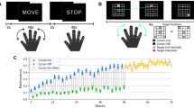 We utilized FS-FAST for the GLM analysis, a FreeSurfer fMRI data analysis tool41. We contrasted fMRI activity between “Move” versus “Stop” conditions and continuous feedback (CF) versus binary feedback (BF), respectively, for the localizer session and the main session. For each session, the regressors of interest were computed by convolving boxcars encoding the contrasting two conditions with the SPM canonical hemodynamic response function (HRF) of zero derivatives. We added nuisance regressors, which are motion parameters created in preprocessing, and third-order polynomial regressors to the design matrix for the GLM analysis. After the first-level analysis, individual results were concatenated into one file with the “isxconcat-sess” function. Then, group GLM was performed with “mri_glmfit .” Multiple comparison correction was done by “mri_glmfit-sim” with cluster-forming threshold (CFT) of p < 10−4 and cluster-wise p-value of p < 0.05. The final full width at half maximum (FWHM) of the inherent smoothness was considered for multiple comparisons correction. A similar analysis was also done on the localizer result with different conditions of “Move” and “Stop” to identify regions responding to hand movement (Supplementary Fig. 3A).