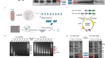 We generated the construct pET29a-H2AH2BH3H4, which enabled poly-cistronic expression of xenopus core histones33, i.e., H2A, H2B, H3, and H4 (Supplementary Fig. 1a, and Supplementary Note 1). pET29a-H2AH2BH3H4 was transformed into E. coli BL21(DE3) Rosetta, generating the strain Ec-AB34. The expression of histones in Ec-AB34 was induced with IPTG (400 µM), and analyzed with SDS-PAGE. H2A, H2B, H3, and H4 were found primarily in the soluble fraction of the Ec-AB34 lysate (Supplementary Fig. 1b, c). While the histone H2A was among the highest expressed proteins compared to native proteins, H2B, H3 and H4’s levels were lower with significant amounts produced. To determine if the eukaryotic histones can assemble in vivo to form core nucleosomes in E. coli that has a cellular environment distinctly different from eukaryotes, we performed the in situ micrococcal nuclease digestion assay (herein named ecMNase) (Supplementary Fig. 1d), which was modified from the similar assay previously used to detect nucleosome formation in eukaryotic cells34,35. When expression of xenopus core histones was induced by IPTG (Supplementary Fig. 1e), ecMNase experiments showed it yielded a distinct DNA fragmentation pattern (Fig. 1a) resembling the fragmentation of nucleosome-protected DNA in eukaryotic cells by MNase digestion36,37,38. Note the protected DNA bands for mono-nucleosome (~147 bp) (Supplementary Figs. 2 and 3) and di-nucleosome (~300 bp) were absent for control strain Ec-pET29a.