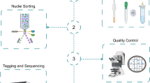Since the quantity and quality of banked tissue varies greatly, we tested four tissue protocols prior to 10X genomics gel beads in-emulsion (GEM) capture (Fig. 1b). First, we tested whether sample (where “sample” collectively refers to both cells and nuclei) impacted the number of genes detected in downstream analysis. Second, we tested whether the preparation method (collectively referring to performing sample filtration alone or sample filtration followed by FACS enrichment, see Methods) improved data quality. To demonstrate protocol efficacy, two biospecimens were selected from apparently healthy individuals and pooled to create 142 mg of total tissue (Fig. 1b). Approximately 7.4 × 105 cells were recovered after homogenization and sequential filtration steps. Samples (pooled cells or nuclei) were divided for one of four protocols and loaded according to manufacturer guidelines: whole cell or nuclei samples, with or without sorting preparations. Note that when working with nuclei from a sorted preparation, we are referring to cells that were sorted prior to nuclei extraction. A summary of capture statistics is shown in Table 1.