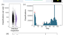 To test the reliability and accuracy of the neural network in differentiating the antibiotic-susceptible phenotypes from untreated E. coli MG1655, a rotating holdout test was performed (Fig. 3a). For each experiment, a model was independently trained and validated on data from three of the biological replicates and tested on the fourth. The validation and testing datasets were balanced to include an equal number of untreated and antibiotic-treated cell images to minimise prediction biases. The average balanced accuracy of the models on the four test datasets exceeded 95% for all antibiotics: ciprofloxacin~99 ± 1.5%, gentamicin~98 ± 2.5%, chloramphenicol~95 ± 8.8%, carbenicillin~99 ± 1.6% (Fig. 3b). Looking at the models’ predictions, the cells that were classified with high confidence (Fig. S6) demonstrated the characteristic antibiotic phenotypes (Fig. 2).