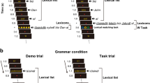 Notably, ISL has a separate syntax from Hebrew, including properties of other studied sign languages—such as right periphery of the syntactic tree (e.g., elements of the higher nodes of the sentence, such as wh-elements, or pronouns in yes/no questions, may appear sentence-final73), use of facial expressions as syntactic markers (e.g., eyebrow raise in yes/no questions, and eyebrow furrow in content questions), and the frequent use of unique syntactic structures such as pseudo-clefts and role-shifts74,75,76. Some examples of differences between the syntax of the two languages can be found in interrogatives and negation76: whereas in Hebrew, the wh- element appears in the beginning of the sentence, both in subject- and in object questions (similarly to English), in ISL the wh-element in object question structures remains in-situ (i.e., in the original position of the object in the sentence) and appears in a sentence-final position (you eat what?—“what did you eat”), and the question is produced with a facial expression that acts as a syntactic marker. In addition, and unlike Hebrew, negative markers in ISL generally follow the verb rather than precede it (i know not—“I don’t know”). In this study, most of the sentences we used included unique ISL structures, as can be seen in Supplementary Table S1. Learning participants in the current study were taught all the abovementioned structures that differ between ISL and Hebrew as a part of the sign language course.