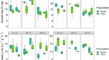 Across all incubations, NPP rates ranged from −30.3 to 264.9 µmol C gDW−1 h−1 (Fig. 1b). As expected, rates of NPP displayed a non-linear response to light, increasing rapidly with exposure to low light levels and saturating at PAR values > 300 µmol photons m−2 s−1 (Supplementary fig. 1a). In both seasons, there was a significant linear decrease in maximum photosynthetic rates with age (OLS) regression, Summer: R2 = 0.85, p < 0.001, n = 30; Spring: R2 = 0.44 p < 0.001, n = 24), although the spring cohort had a slower rate of decline with age than the summer cohort (Supplementary fig. 1b). Negative photosynthetic rates reported are apparent respiration rates when PAR was equal to zero.