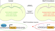 In addition to its role in neurogenesis, we found that MED13L is crucial for proper dendrite development. Proteomic and neuronal morphometry analyses of cortical tissues from homozygous KO mice showed significant impairments in dendritic development of pyramidal neurons. These dendritic abnormalities in cortical pyramidal neurons of Het mice may underlie the motor coordination deficits observed in behavioral assays, linking structural brain defects to functional outcomes. Similar dendritic impairments in cortical pyramidal neurons were observed in mice with conditional knockout of Med13l in cKO mice (Supplementary Fig. 5D–G), underscoring the cell-autonomous role of MED13L in neuronal morphogenesis. This cell-autonomous action of MED13L in dendrite development is consistent with a recent report showing impaired dendrite arborization after in-utero electroporation of different mutant forms of MED13L into cortical pyramidal neurons28. Further studies are needed to investigate whether axon projection and synapse formation are also affected by MED13L deficiency, as suggested by our transcriptomic analysis. Understanding these aspects could provide deeper insights into the full spectrum of MED13L’s role in neuronal development and its impact on neurological function.