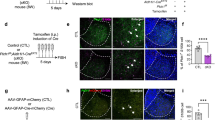 For immunohistochemical analysis, brain sections were permeabilized at room temperature (RT) in 0.3% Triton X-100 (Sigma), followed by 1 h RT blocking in 5% Goat-Serum 0.5% Triton X-100 and overnight incubation with primary antibodies (1/500 NeuN, MAB377 Millipore, RRID AB_2298772 or 1/400 PCNA, Sigma-Aldrich, P8825, RRID AB_477413) at 4 °C. For Glutamine Synthetase (GS) immunostaining, the blocking solution was 15% Goat-Serum 2.5% Triton X-100, and the primary incubation was made for three overnights in 1.5% Goat-Serum 2.5% Triton X-100 solution (1/1000 Glutamine Synthetase, MAB302 Millipore, RRID AB_2110656) After washing, sections were incubated for 2 h RT with Alexa-fluorophore-conjugated secondary antibodies (Invitrogen). Confocal microscopy was performed with a Stellaris 5 (Leica) Laser Scanning System or a Stellaris 8 (Leica) Scanning System and images were processed and analyzed by FIJI/ImageJ Software. Confocal images for GCaMP6f/8 s and TVA-og signal, for NeuN, PCNA or GS immunofluorescence were used to manually outline positive cells.